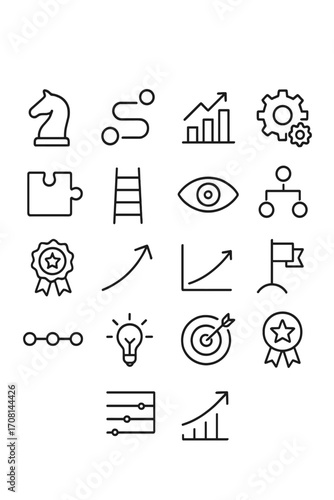 Strategic Actions icons in minimalistic line art style: chess knight, roadmap icon, bar graph, gears icon, puzzle piece, ladder steps, focus eye,