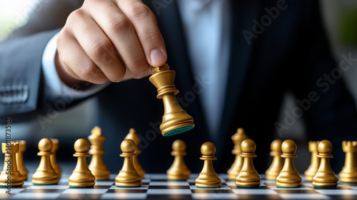 Strategic businessman moving golden chess piece chessboard, showcasing focus and determination