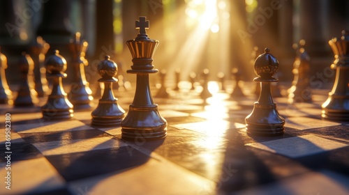 Strategic King: A cinematic shot of a chess board, bathed in sunlight, the focus on the king piece, emphasizing strategy, power, and complex game play.