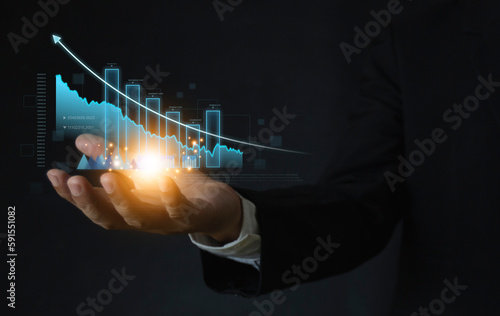 strategic planning, Businessman or trader is showing a growing stock of virtual holograms. invest in trading. aim for success, Strategize, business technology background