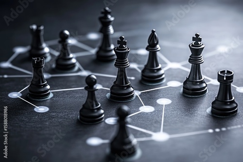 Strategic planning concept with chess kings, queens, pawns linked in flowchart