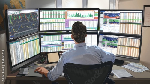 Strategic Risk Analysis Expert Financial Analyst Reviewing Data on Multiple Screens in Dedicated Workspace