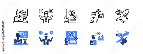 Strategy, Decision making, Objectives, Mission, Vision with two styles, line and duotone icon.