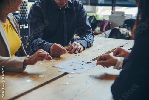 Strategy Planning and Solution Business Concept. Group of Business people holding piece of jigsaw puzzle to solution problem on wooden desk. Professional Businessman and Partnership meeting in office.