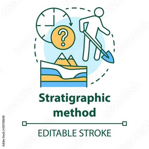 Stratigraphic method concept icon. Arheological excavation, historical layers. Study of sedimentary and layered rocks idea thin line illustration. Vector isolated outline drawing. Editable stroke