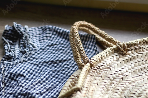 Straw bag and gingham prrint top. Summer outfit details. Selective focus.