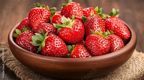 Strawberries in a bowl on hessian, wood surface. Perfect for recipe blogs/food promotion