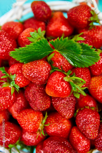 Strawberries in white basket. Fresh strawberries. Beautiful strawberries.