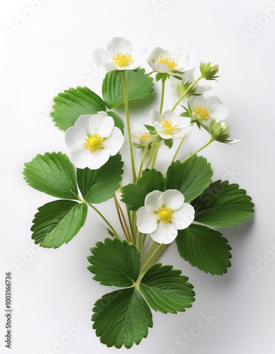 strawberry plant, leaves and flowers on white background