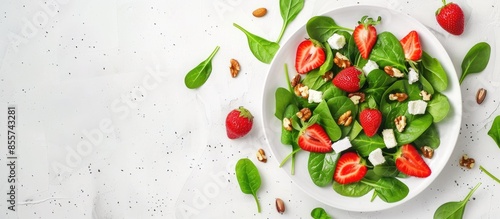 Strawberry salad. Spinach leaves, sliced strawberries, nuts, feta cheese on white background. Healthy food concept. Flat lay, top view. with copy space image. Place for adding text or design