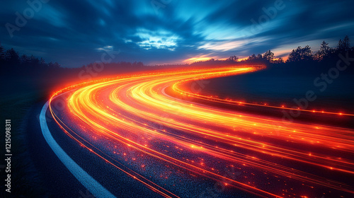 Streaks of light from a fast-moving car against a vivid blue sky showcasing high-speed motion blur effect light trails in a minimalistic composition with blank caption space on the side modern and dyn