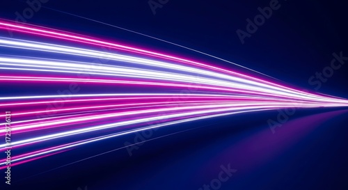 Streaks of neon pink and white lights converge on a dark blue background creating a sense of speed and motion