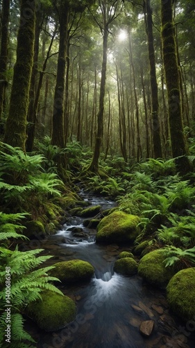 Stream meanders through lush, dense forest, with sunlight filtering through canopy above. Moss-covered rocks, vibrant ferns line banks of gently flowing water, creating tranquil, picturesque scene.