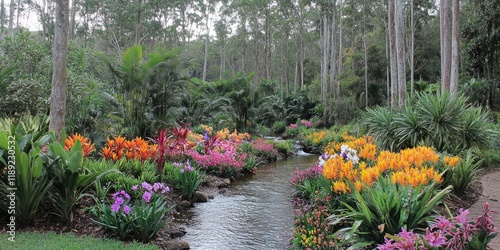 Streamside garden, vibrant flowers, lush forest, tranquil scene, nature poster