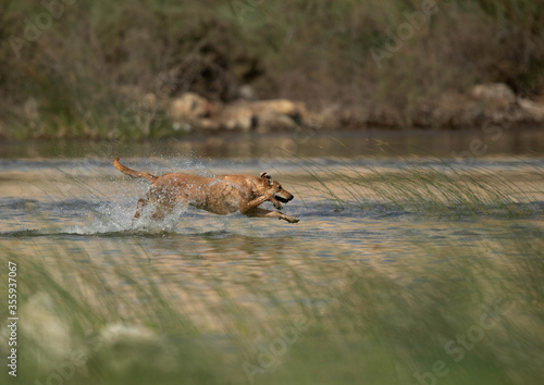 Street dog running to catch wild birds in Buhair lake, Bahrain