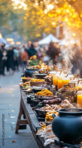 Street festival celebrating Halloween with witches selling eerie snacks cauldrons of glowing drinks