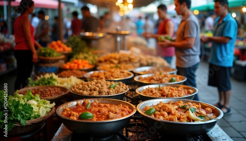 Street food market in Thailand. Various food dishes served in bowls. People visible in background. Outdoor market scene. Food preparation in progress. Busy atmosphere. Colorful dishes. Local food