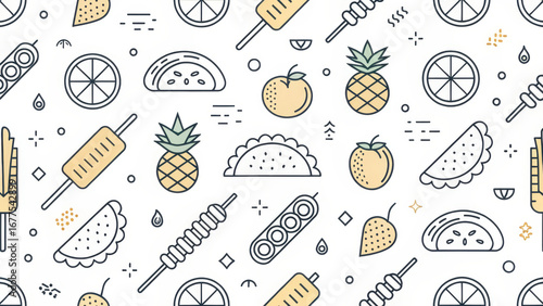Street food pattern linear icon seamless snack outline fruit doodle taco skewer pineapple pastel color minimal style energizes menus, packaging, and blogs with playful culinary charm