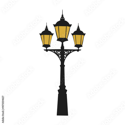 Street lamp with three shining lanterns at night. PNG image, transparent background