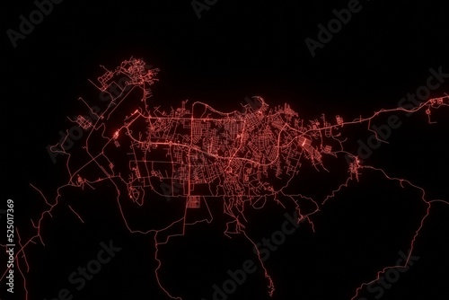 Street map of Malabo (Equatorial Guinea) made with red illumination and glow effect. Top view on roads network. 3d render, illustration