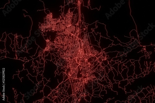 Street map of Windhoek (Namibia) made with red illumination and glow effect. Top view on roads network. 3d render, illustration