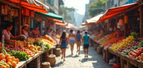 Street market in Rio de Janeiro during festival time. Colorful fruit food stalls sell fresh produce. People walk, shop, enjoy daily life in Ipanema district of Brazil, South America.