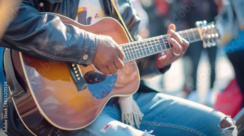 Street Musician Playing Acoustic Guitar for Outdoor Crowd in Sunlit Setting