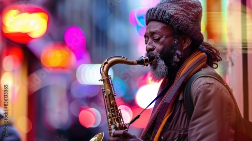 Street Musician Playing Saxophone with Vibrant City Lights in the Background