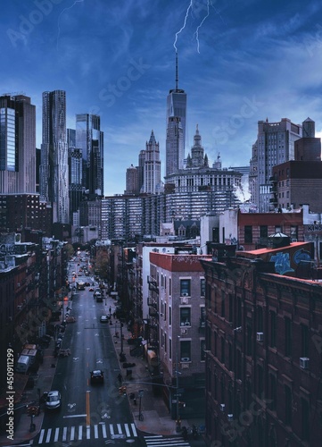 street New York city night buildings traffic cars people urban cloudy lightning sky