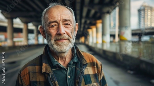 Street portrait of an elderly man on blurry background of railway station in Europe.