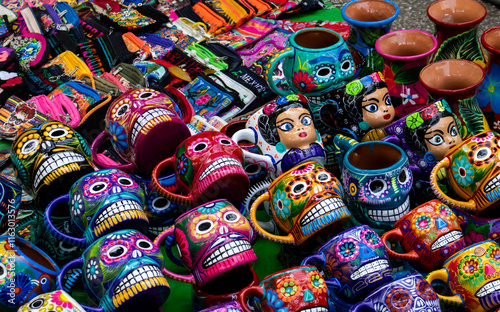 Street sale of handicrafts alluding to the Day of the Dead in Mexico City. Cups decorated with colorful skulls. Frida cups.