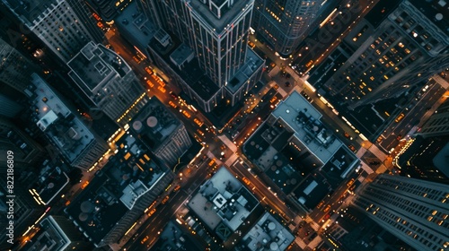 Street View from the Top-Down of New York City Streets at Night with Visible Grid System, Business and Residential Roofs. Busy Center with Traffic, Cars, Yellow Taxis, Commercial Vehicles, and