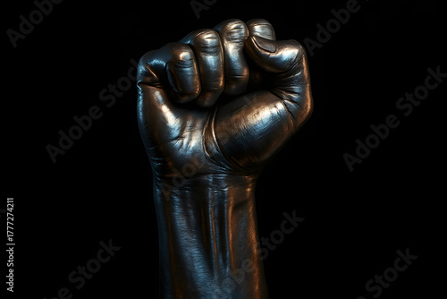 Strength and Solidarity: A fist, rendered in a striking, metallic sheen, symbolizing power, unity, and unwavering resolve against a backdrop of darkness.