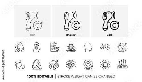Stress grows, Cough and Coronavirus line icons. Pack of Riboflavin vitamin, Hospital, Electronic thermometer icon. Vitamin u, Medical mask, Face scanning pictogram. Medical flight. Line icons. Vector