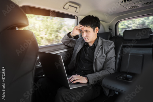 stressed business man using laptop computer while sitting in the back seat of car