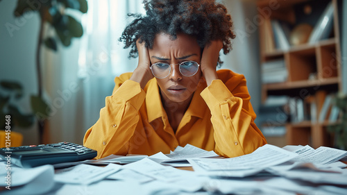 Stressed individual surrounded by a pile of tax documents and receipts.