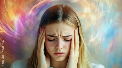 Stressed woman holding head with eyes closed, experiencing intense headache or anxiety.