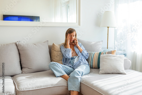 Stressed Woman in Casual Outfit Talking on Smartphone at Home