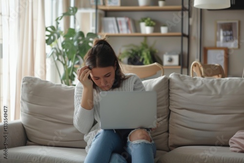 Stressed Woman Navigating Troubling News While Sitting on Sofa at Home in the Afternoon