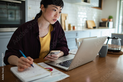 Stressed woman reviewing bills and finances on laptop at kitchen table