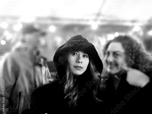 Striking Asian woman stands out in crowd with black hood.