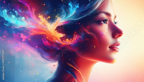 Striking Double Exposure Portrait of a Woman in an Abstract Fantasy Setting, Fused with Vibrant Colors and Digital Artistic Techniques.
