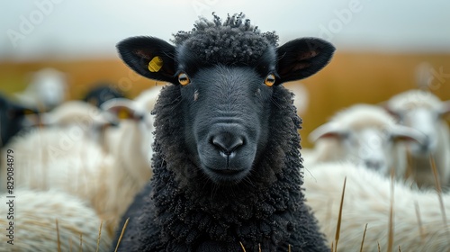 Striking Illustration of a Black Sheep Standing Out Among White Sheep, Symbolizing Individuality and Distinction