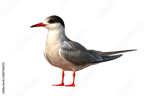 Striking photograph of a common tern seabird with sleek body, long wings, bright red bill, perched on shore in soft natural light, PNG file isolated on transparent background