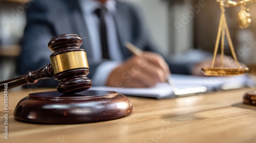 Striking Portrait of a Judge Embracing Justice and Law, Sitting on a Desk with Elegant Furnishings.