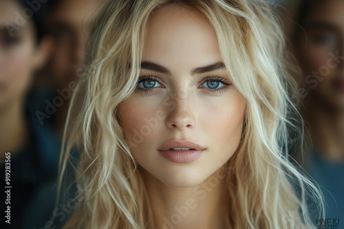 striking portrait of confident blonde woman emerging from crowd selective focus and desaturated background emphasize individuality and leadership
