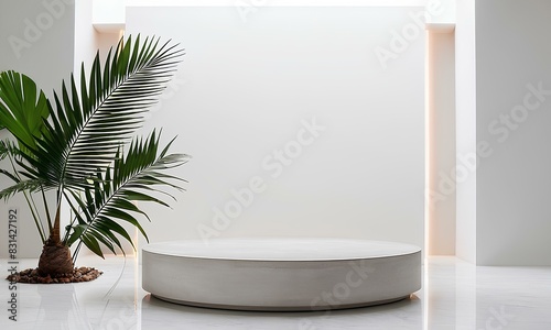 Striking Visual Balance: Concrete Podium with Palm Leaves and White Backdrop