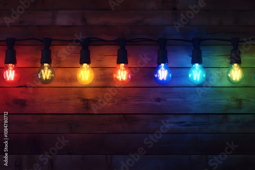 String lights with vibrant multicolored bulbs draped casually over rustic wooden background. Festive decor concept