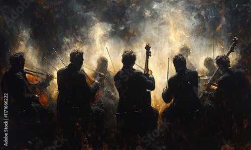 String quartet performing, dark background, golden light.