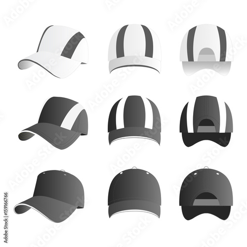Strip baseball cap grey color with colored mesh and adjustable rubber strap isolated vector set
